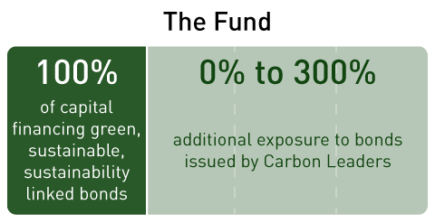 The Fund targets approximately 100% of its Net Asset Value (“NAV”) (equivalent to at least twenty-five percent (25%) of the Fund’s total investments in fixed income securities if the Fund was geared to the maximum permitted level) in green, sustainable or sustainability-linked bonds (“SLB”) or other fixed income securities, which seek to exclusively finance green and sustainable projects or activities (or are linked to positive climate outcomes), and the remaining proportion of up to 300% in bonds issued by ‘Carbon Leaders’, cash, cash-equivalents and related derivatives.