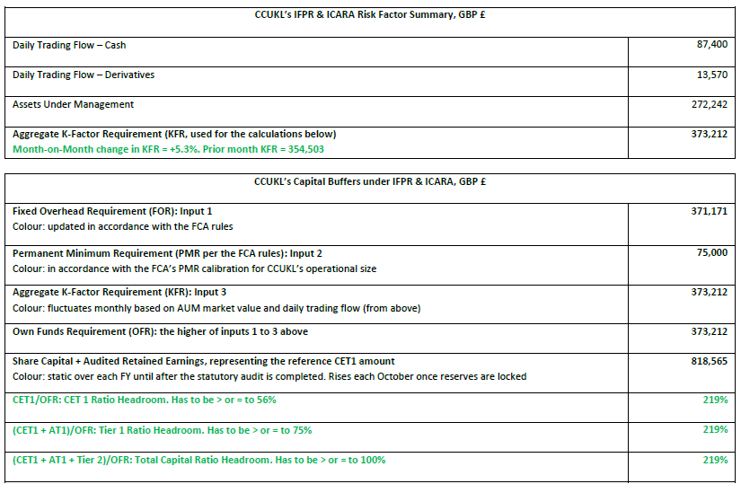 CCUKL is required to at all times maintain own funds that are at least equal to the Firm’s own funds requirement. The own funds requirement is the minimum requirement of capital the Firm is required to hold, taken as the higher of the PMR and FOR. Please refer to the IFPR summaries above.